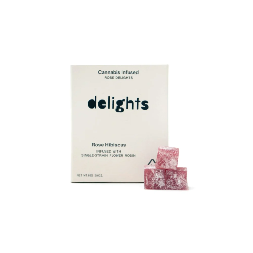 Rose Hibiscus: water, cane sugar, tapioca syrup, non-gmo potato starch, rosewater, hibiscus powder, mct coconut oil, non-gmo citric acid, cannabis flower rosin, kosher salt, Coating: tapioca starch, powdered sugar