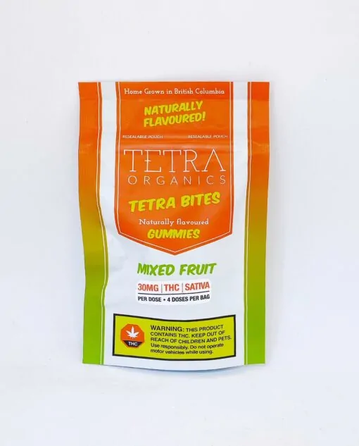 Tetra Bites Gummy Candies – from Tetra Organics in Victoria BC, are Naturally flavoured Gummies. Each delicious tasting gummy, made with the highest quality natural products and flavours like their finest cannabis flowers for their BHO and RSO extracts, packs contain either 30mg of THC per dose with 4 doses in each resealable package.